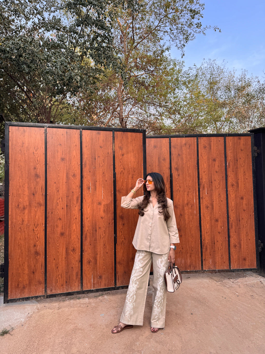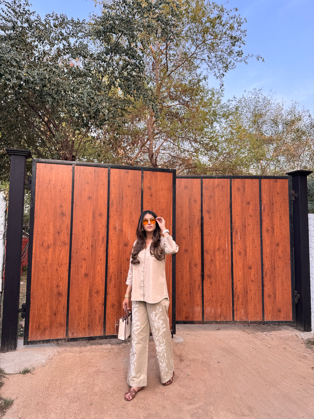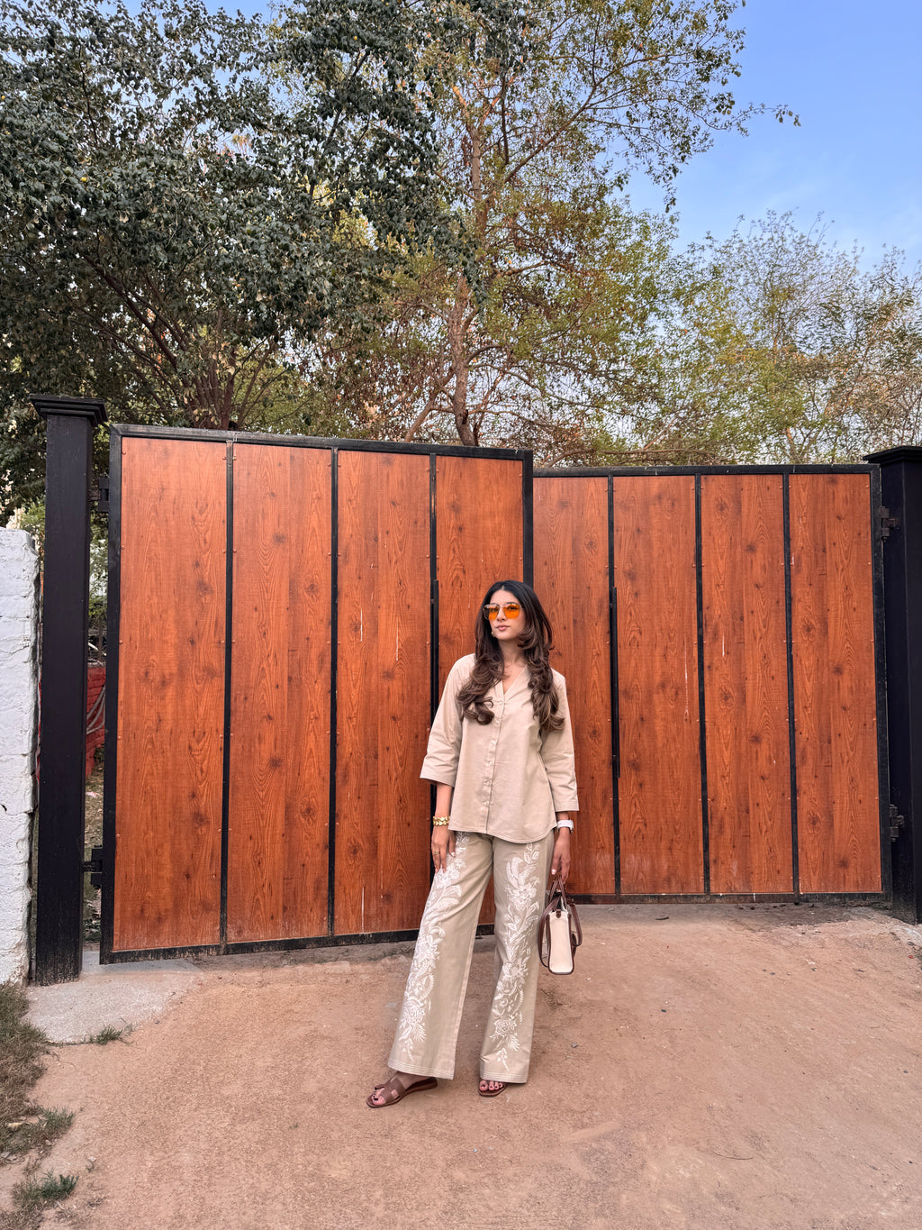 Beige Linen Embroidered Set – Subtle Floral Detailing with a Sophisticated Look
